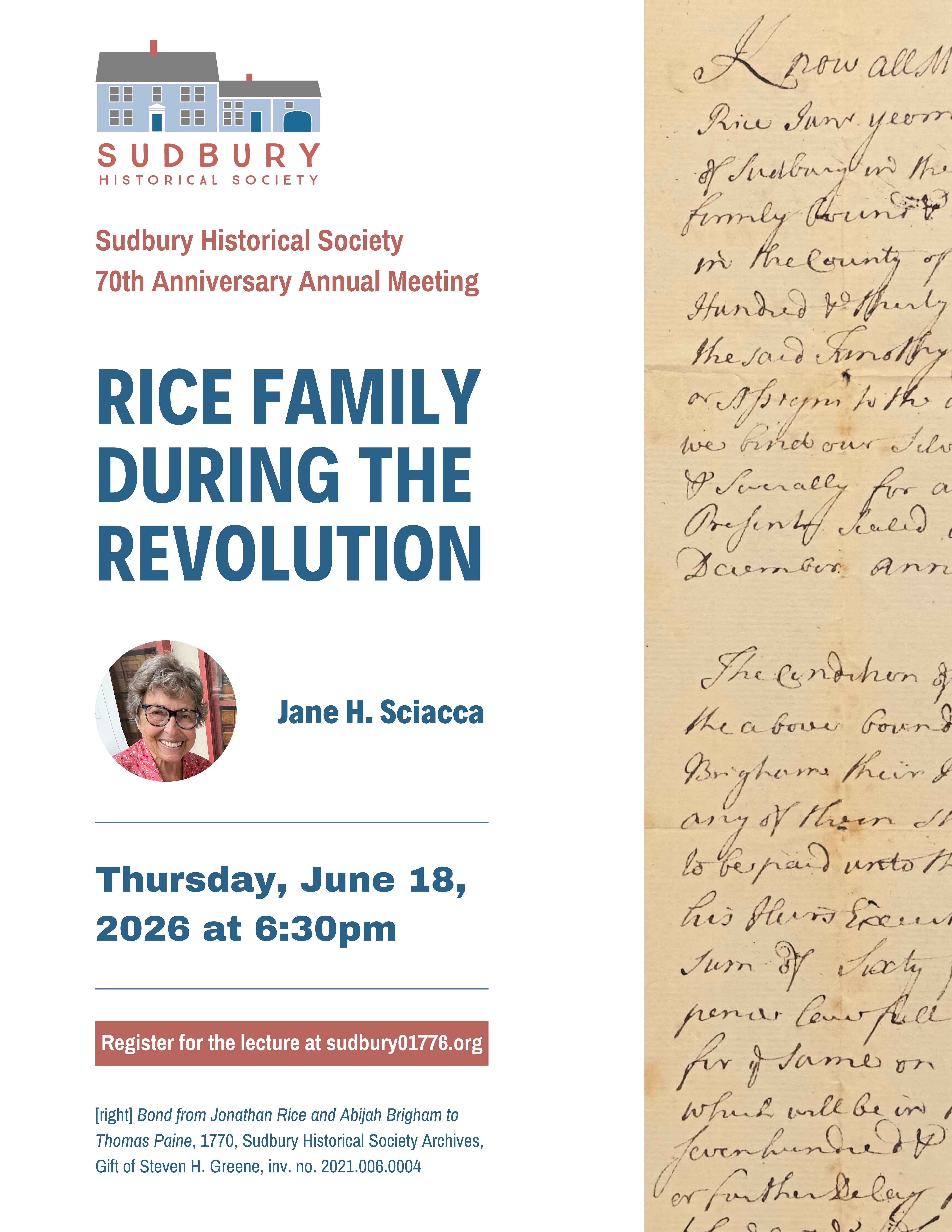 Join us at the Sudbury History Center and Museum for a fascinating lecture by Jane H. Sciacca on the Rice Family During the Revolution on the occasion of the 70th Anniversary Annual Meeting of the Sudbury Historical Society (SHS)!